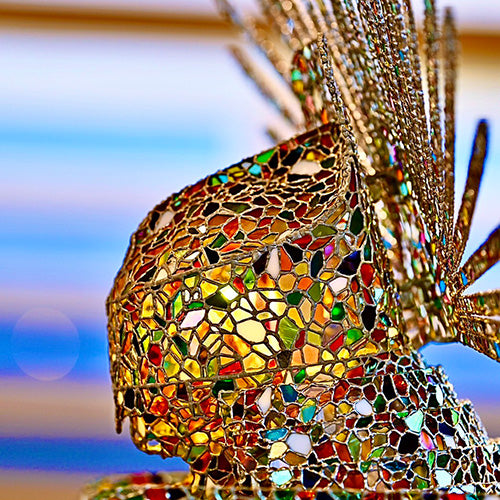 製作を手掛けたのは、ステンドグラスアーティストのヨージウチヤマ氏。秀吉公の代名詞とも言える「一の谷馬藺後立て付き兜」をモチーフに、威厳ある甲冑姿を現代のアートとして再構築しました。その輝きの源となるのは、世界遺産の修復などにも用いられる希少なヴィンテージガラスです。33色・約20,000ピースにも及ぶガラス片を、72のパーツへと組み上げる精緻な技法により、高さ2mを超える圧倒的な造形美を実現しました。