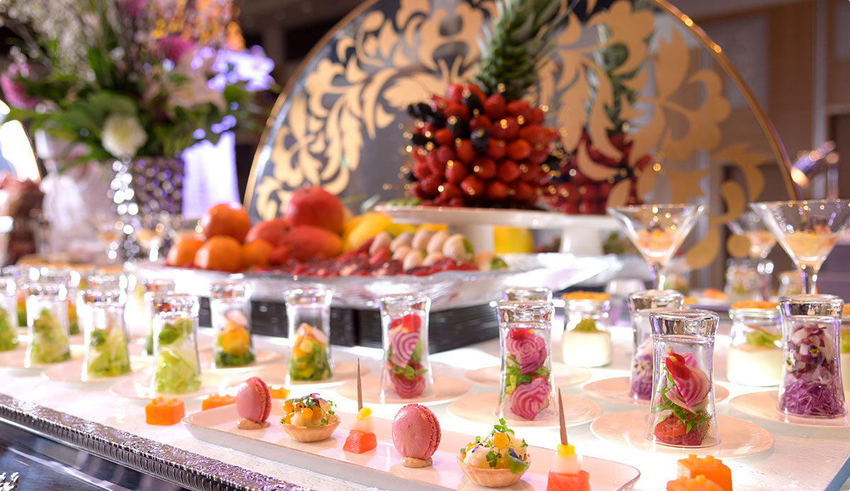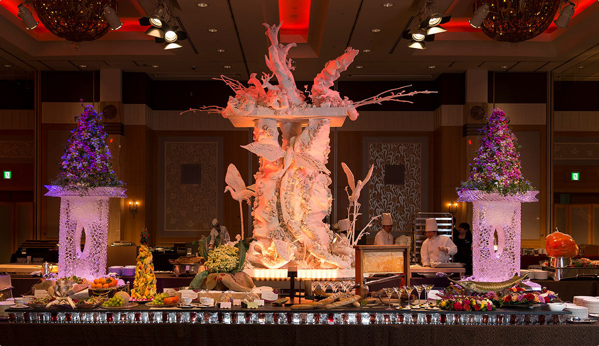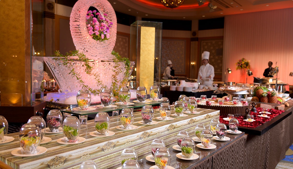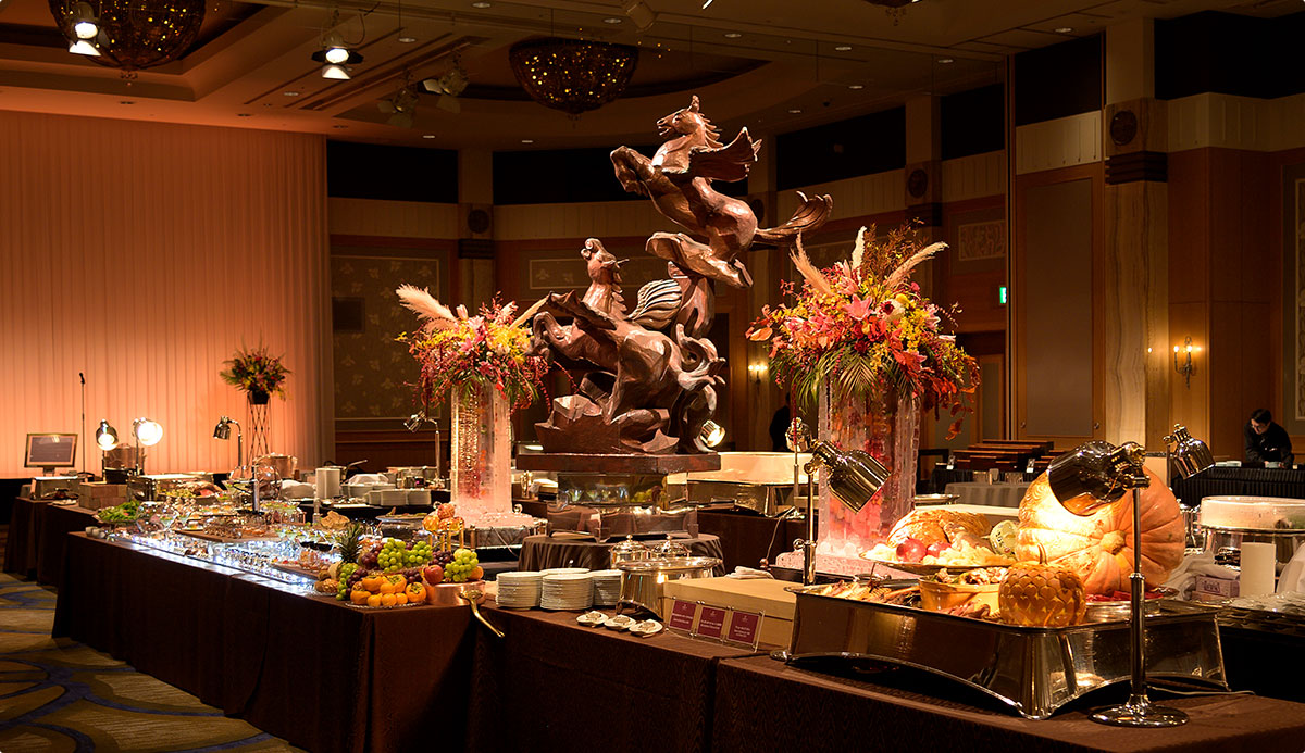 フラワーアレンジメントや氷細工、照明演出など、会場内を華やいだ雰囲気に彩ります。主旨に合わせた空間演出を経験豊かなスタッフがご案内させていただきます。