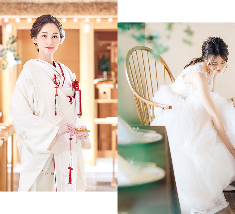 チャペルではバージンロードの意味を大切にした感動挙式を。太鼓橋や茅葺き屋根が印象的な神殿では古式ゆかしい神前式がかないます。