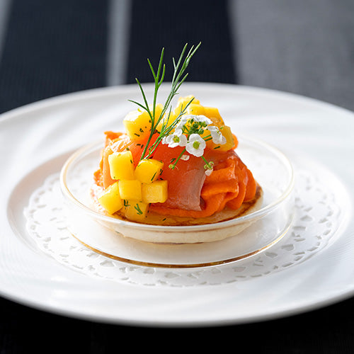 ・スモークサーモンと赤ピーマンのムース ブリニ添え ディル香るマンゴーのソース