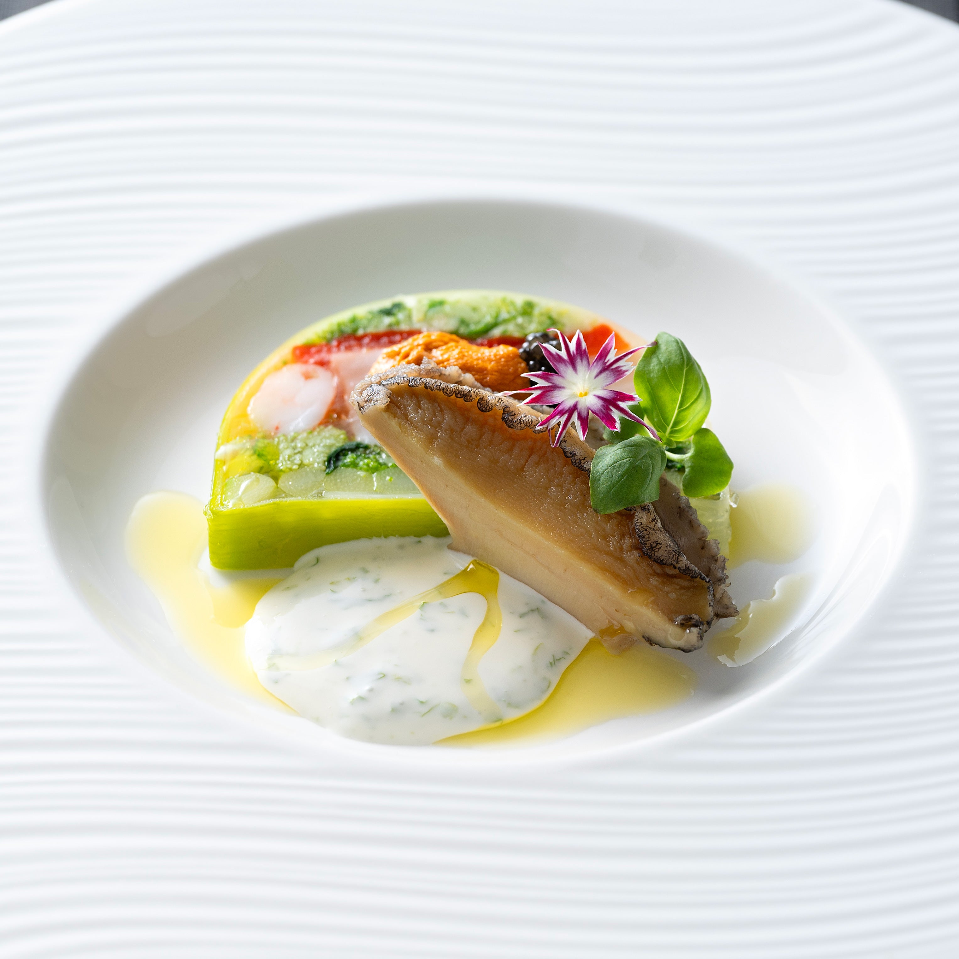 • <温製オードヴル>エゾアワビのコンフィと海老と菜の花のテリーヌ 雲丹とキャビア添え クレーム・ド・アイユ