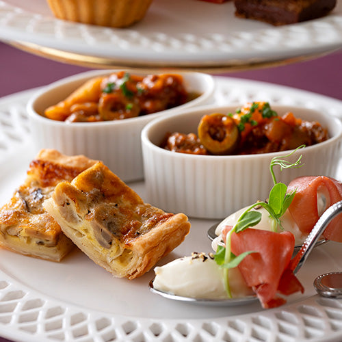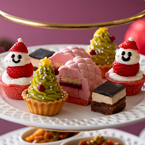 クリスマスツリーの形をしたタルトや、ブッシュドノエルなど、ホリデーシーズンならではバラエティに富んだスイーツと、パーティーフードをイメージした贅沢なセイボリーが、クリスマス気分を盛り上げます。