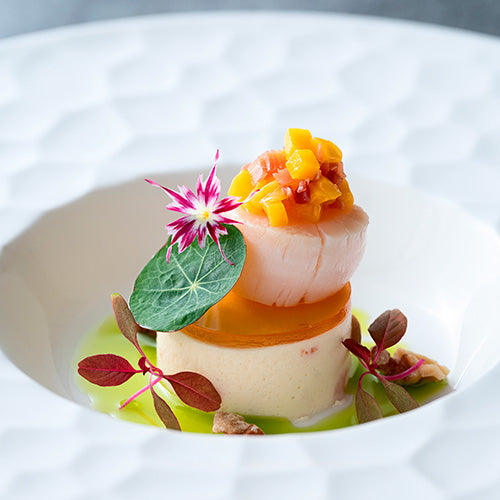 <オードヴル>マスカルポーネとスモークサーモンのムースと帆立のマリネ 生ハムとマンゴーのコンディマン