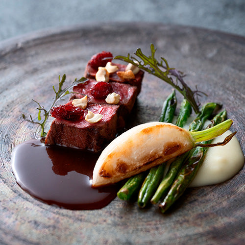 肉料理でご提供する匠の北牛ロース肉のグリルには、クランベリーの酸味とカシューナッツの食感がマッチ。