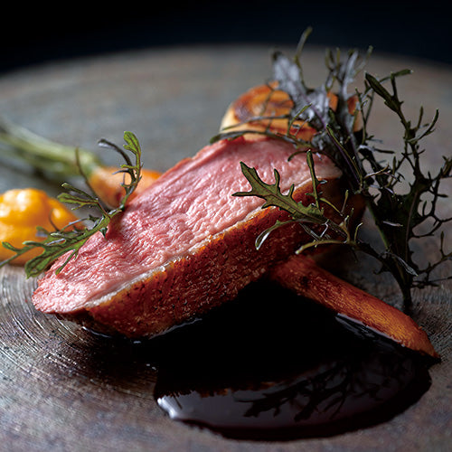 茨城県産“かすみ鴨”のロースト 蜂蜜とエピスの香り下仁田ネギ添え みかんピューレとジャンジャンブルソース
