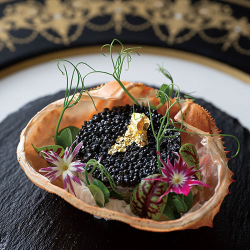 ライム香る蟹身と真鯛と甘海老のガトー仕立てキャビア添え