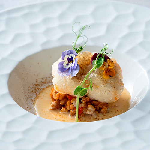 三重県が誇る食材の一つ一つの個性を、フランス料理の技法で丁寧に引き出したフルコースをご用意。上質な味わいの伊勢まだいは、とろける身のやわらかさとクルトンのザクザクとした食感のコントラストが楽しめる一品。伊勢赤どりのテリーヌは、視覚から楽しむ、芸術的な盛り付けも魅力です。
